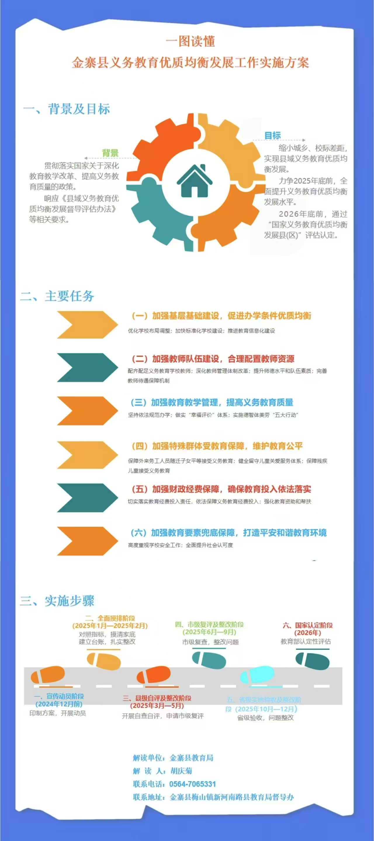 《金寨縣義務教育優質均衡發展工作實施方案(征求意見稿)》共分四個部分,分別是工作目標、主要任務、實施步驟、保障措施等,并附有責任清單,重點是從基礎建設、隊伍建設、教學管理、特殊群體保障、財政經費保障和教育要素兜底等六個方面,明確了17項具體創建任務,并按照省統一規劃的“金寨縣要在2025年通過省級督導評估”的工作目標,安排了宣傳動員、摸排調研、縣級自評、市級復評、省級評估和國家驗收六個實施步驟,提出了工作要求。同時,附件部分明確了相關縣直單位和鄉鎮人民政府創建的責任清單,以利于各單位加強協同配合,履行創建職責,確保創建工作順利推進。