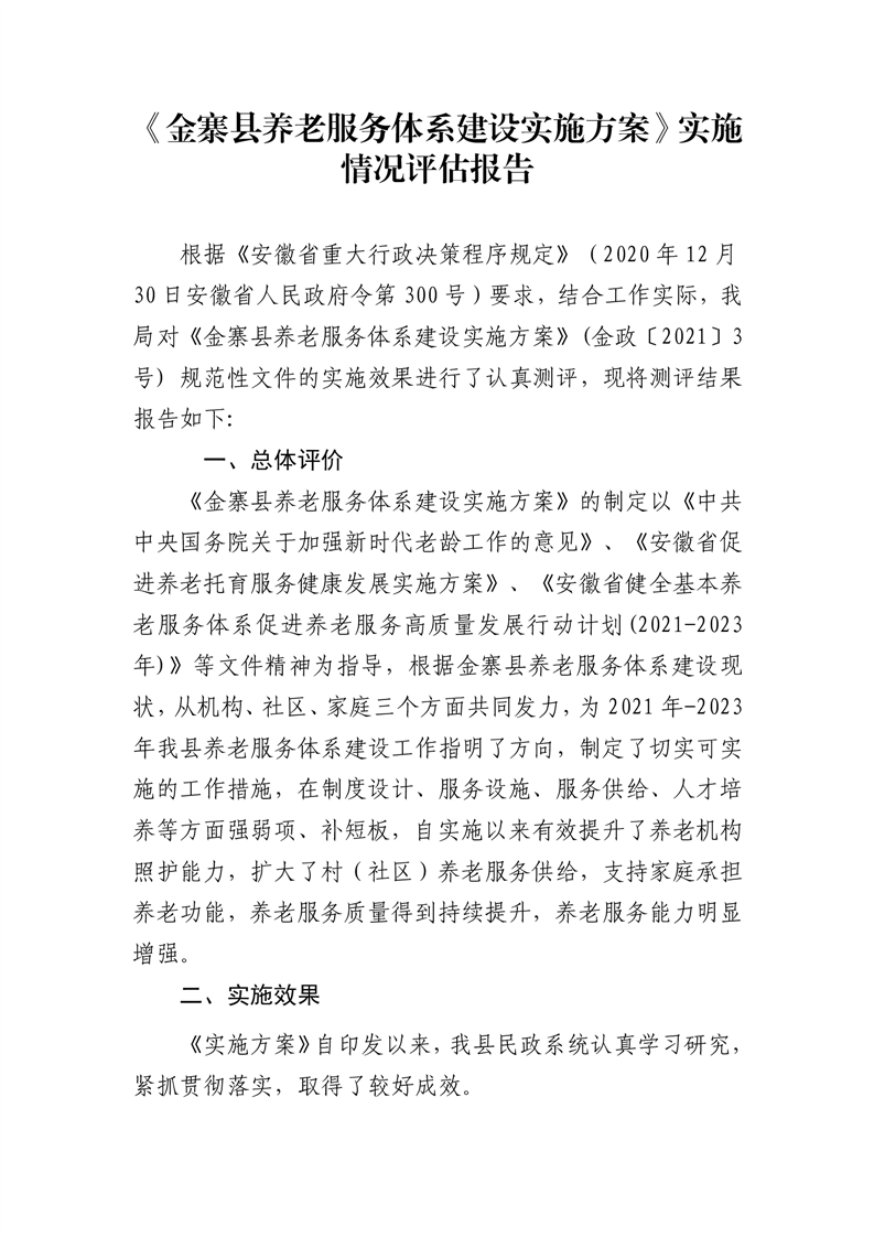 【規范性文件發布后評估】《金寨縣養老服務體系建設實施方案》實施情況評估報告
