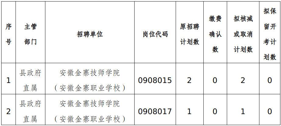 根據《2026年度金寨縣事業單位公開招聘工作人員公告》等規定,經對各崗位報名情況篩查審定,現將達不到規定開考比例崗位的計劃核減或取消情況予以公布。
