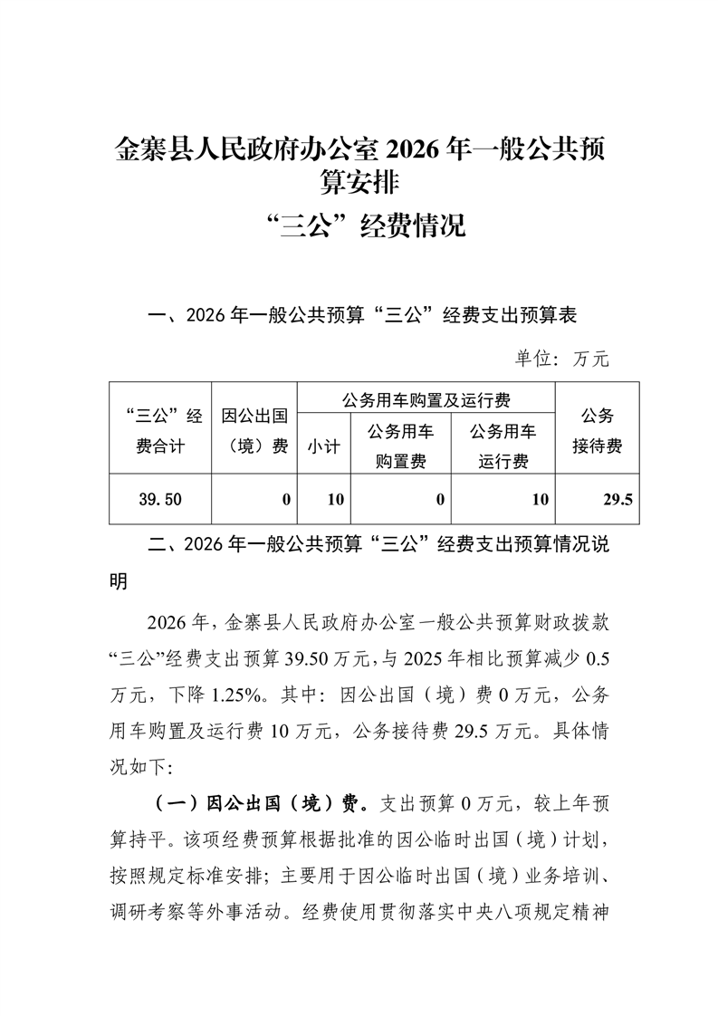 金寨縣人民政府辦公室2026年一般公共預算安排“三公”經費情況