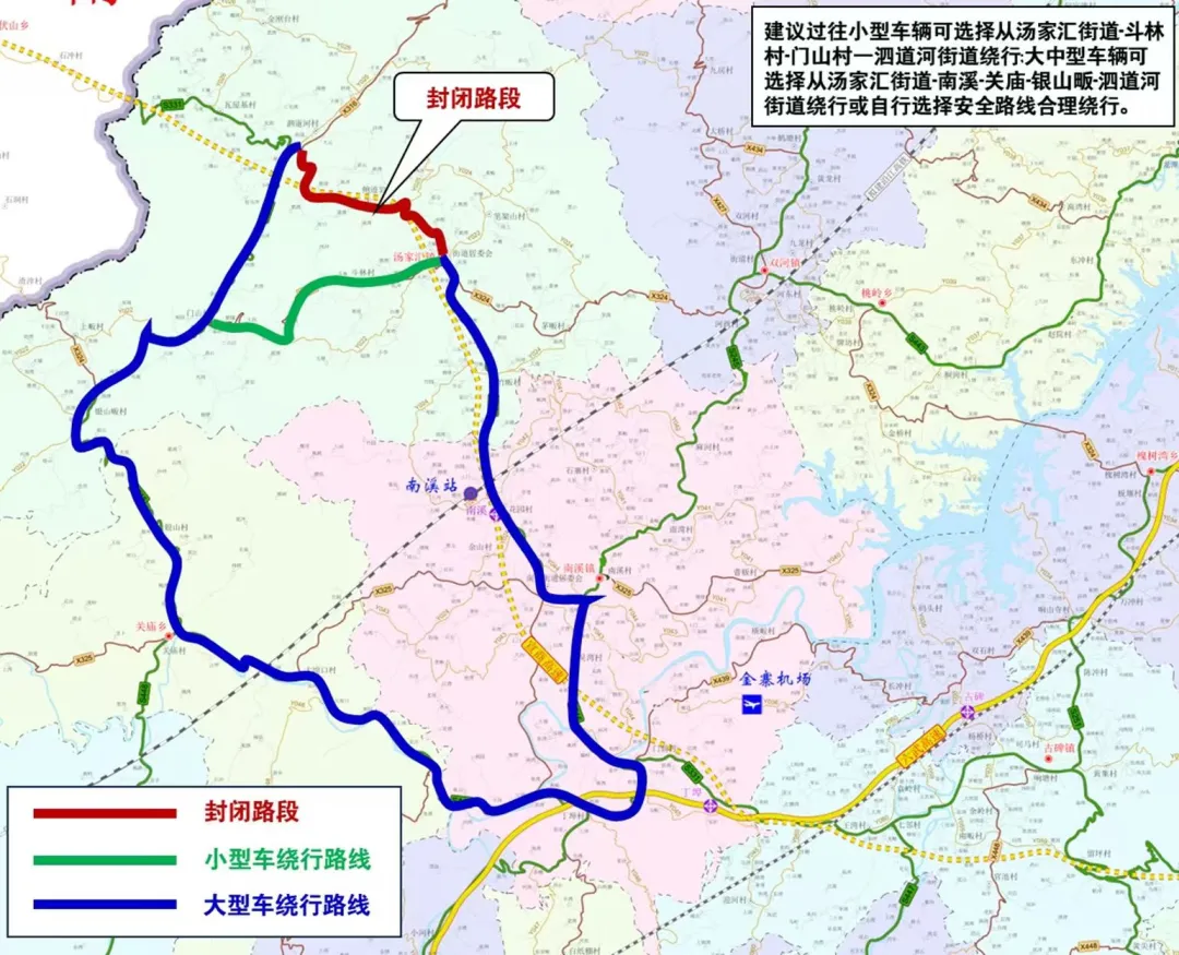 道路施工期間,建議過往小型車輛可選擇從湯家匯街道-斗林村-門山村一泗道河街道繞行;大中型車輛可選擇從湯家匯街道-南溪-關(guān)廟-銀山畈-泗道河街道繞行或自行選擇安全路線合理繞行。
