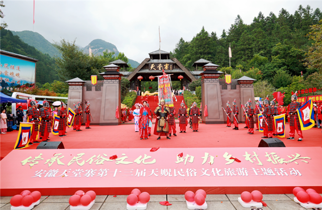上午8點08分,隨著 “開寨門” 儀式的舉行,開幕式在天堂寨景區寨門前準時開啟。“古祭祈年”的傳統場景,《天貺節之歌》《又是一個豐收年》《農耕秀》等民俗歌舞,全面展示了天堂寨的自然風光與文旅魅力,拉開了全天活動的序幕。