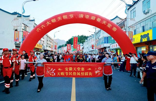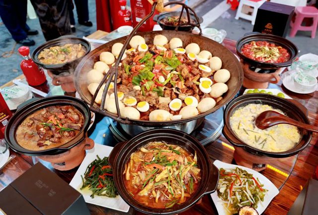 晚間,《暢游江淮?皖美鄉宴行》千人吊鍋宴體驗活動正式啟動,非遺、民俗風情踩街活動沿天堂寨鎮主街道同步進行,游客一邊吃著吊鍋,一邊體驗到民俗踩街的熱情氛圍。非遺民俗節目與“大花轎”、寨主隊伍巡游碰撞出民俗傳承的激情,從天街到石河公園,美食、美景、民俗目不暇接。