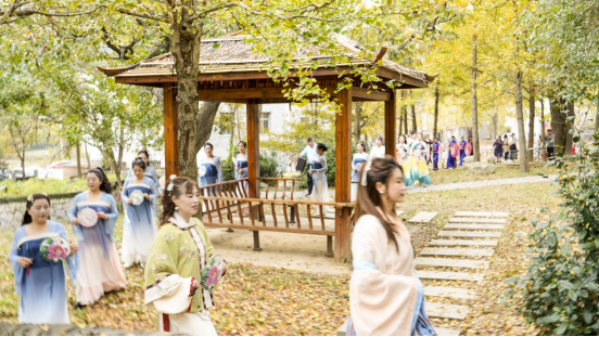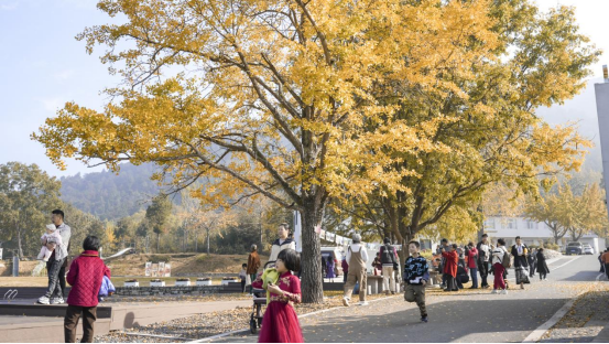 午后陽光正好,游客們漫步于各大場地,沉浸式體驗沙河文化的多元魅力。竹林灣銀杏公園內,漢服巡游隊伍衣袂飄飄,與金色銀杏構成絕美畫卷。