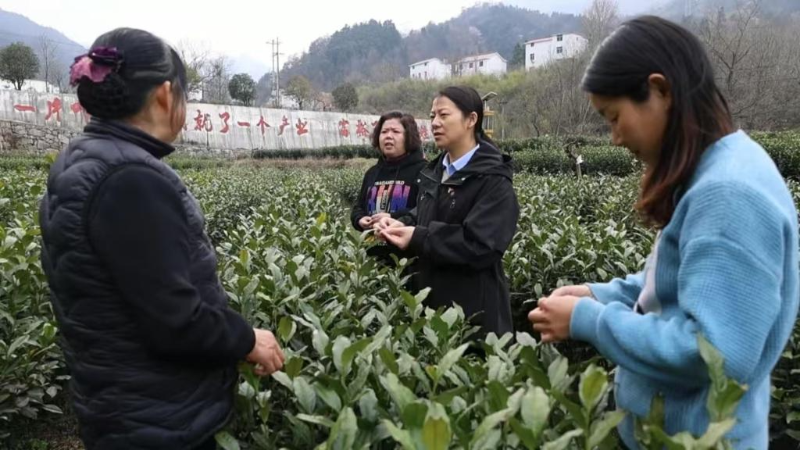 全國政協委員、安徽省金寨縣花石鄉大灣村黨總支第一書記余靜(右二)在茶園里和茶農們交流。(受訪者供圖)