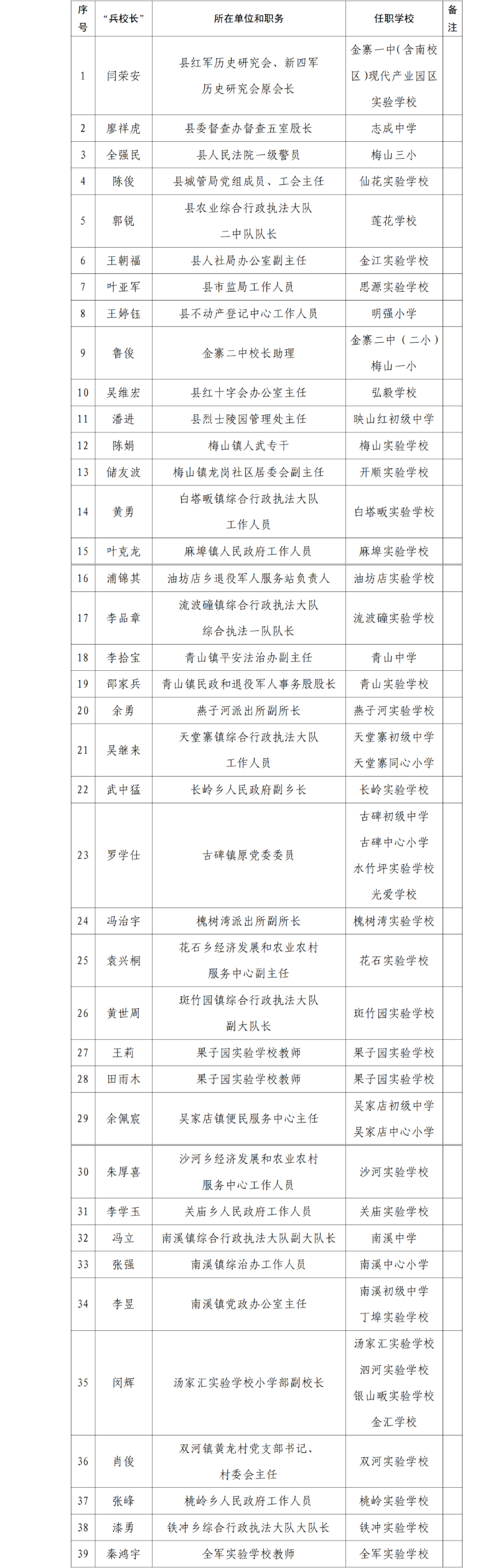 近日,縣退役軍人事務(wù)局、縣教育局聯(lián)合發(fā)文《關(guān)于聘任閆榮安等39名退役軍人為全縣第二批中小學(xué)校“兵校長”的通知》。經(jīng)單位推薦、審核把關(guān)、集體研究,現(xiàn)決定聘任閆榮安等39名退役軍人為全縣第二批中小學(xué)校“兵校長”。希望“兵校長”加強與學(xué)校的常態(tài)化溝通聯(lián)動,認真履行國防教育相關(guān)職責(zé)任務(wù),不斷豐富教育形式、深化教育內(nèi)涵,推動中小學(xué)校國防教育工作再上新臺階。